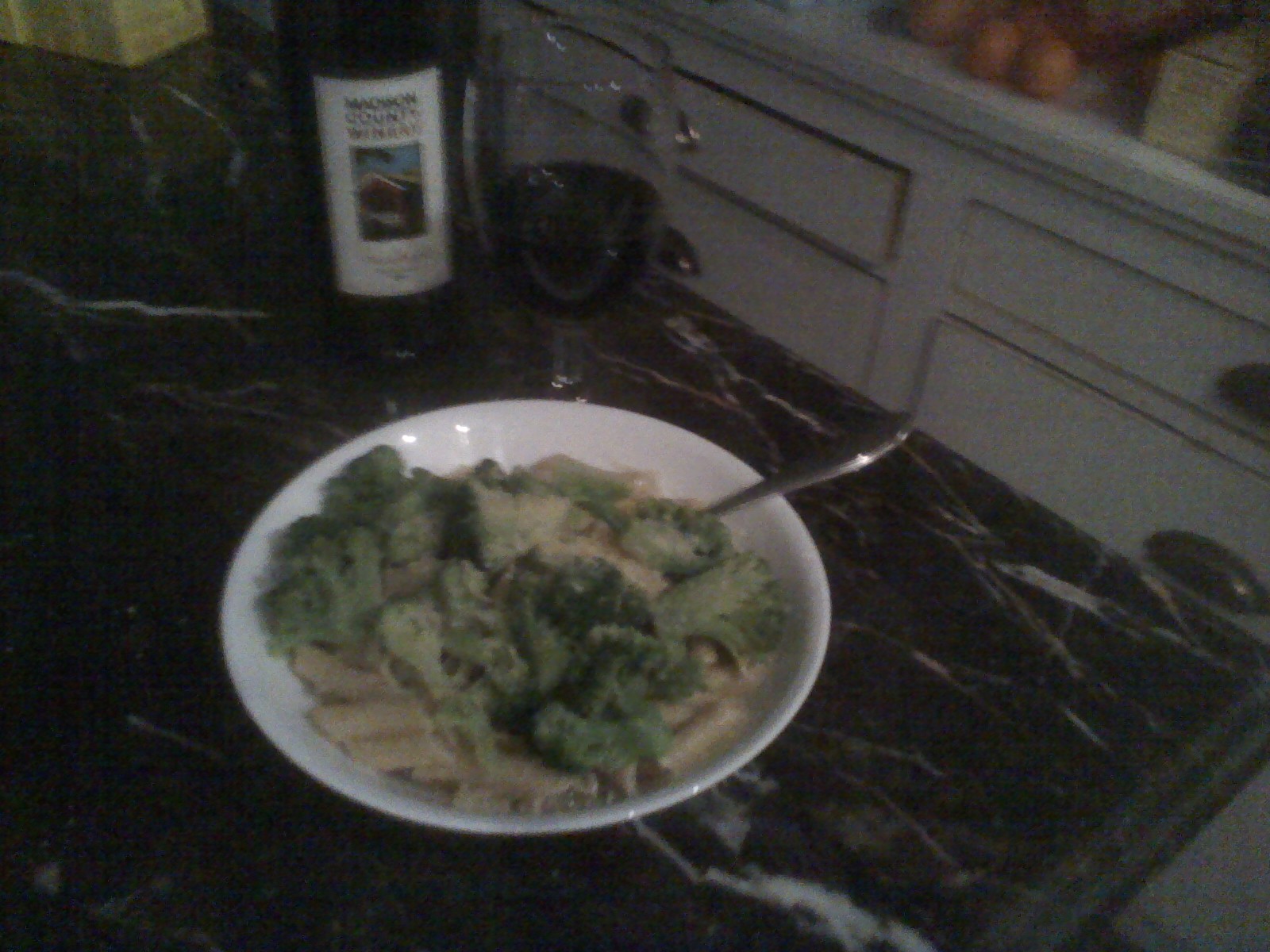 Dinner: (Pictured above) Pasta tossed with olive oil, onion, garlic, cannellini beans and steamed brocoli. I also had a glass of red wine.