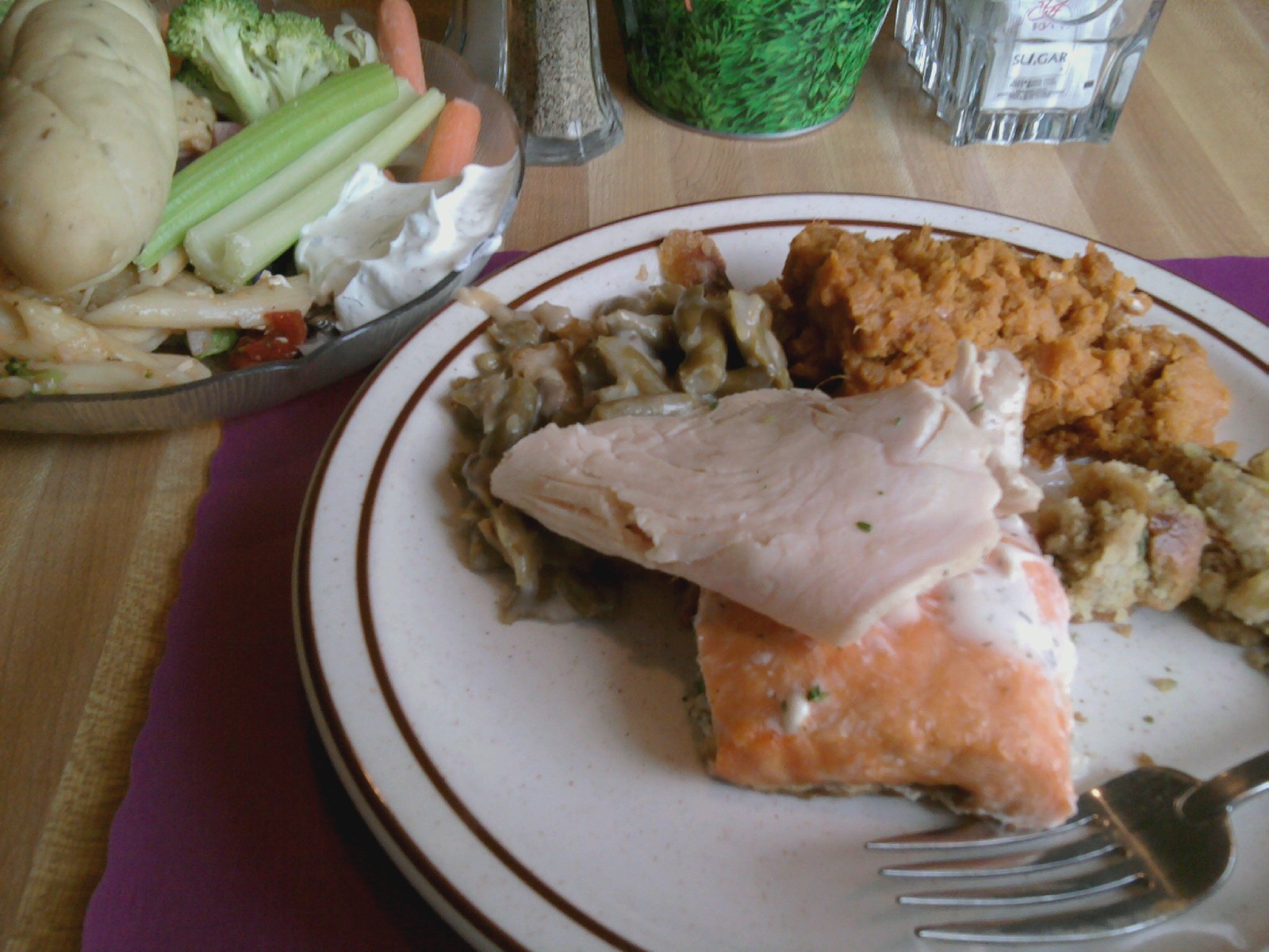 This was my plate today at the Holiday Inn, where we went for its Thanksgiving Day dinner. Add to this a pretty small dessert thing. Didn’t even go back for seconds. But I have to say I’m reminded again how much I like sweet potatoes. Should definitely eat them more often.