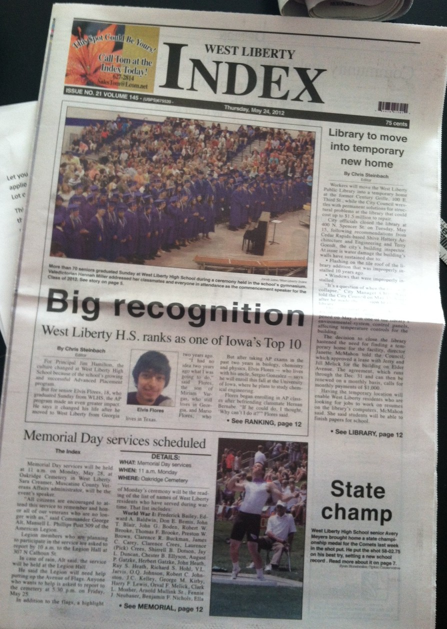 Hot off the press May 23, 2012May 23, 2012Chris Steinbach The June MAY 24 edition of the West Liberty Index … done largely by yours truly. Share this: Click to share on X (Opens in new window) X Click to share on Facebook (Opens in new window) Facebook Click to share on LinkedIn (Opens in new window) LinkedIn Click to share on Tumblr (Opens in new window) Tumblr Click to share on Pinterest (Opens in new window) Pinterest Click to email a link to a friend (Opens in new window) Email Click to print (Opens in new window) Print Like Loading... Related