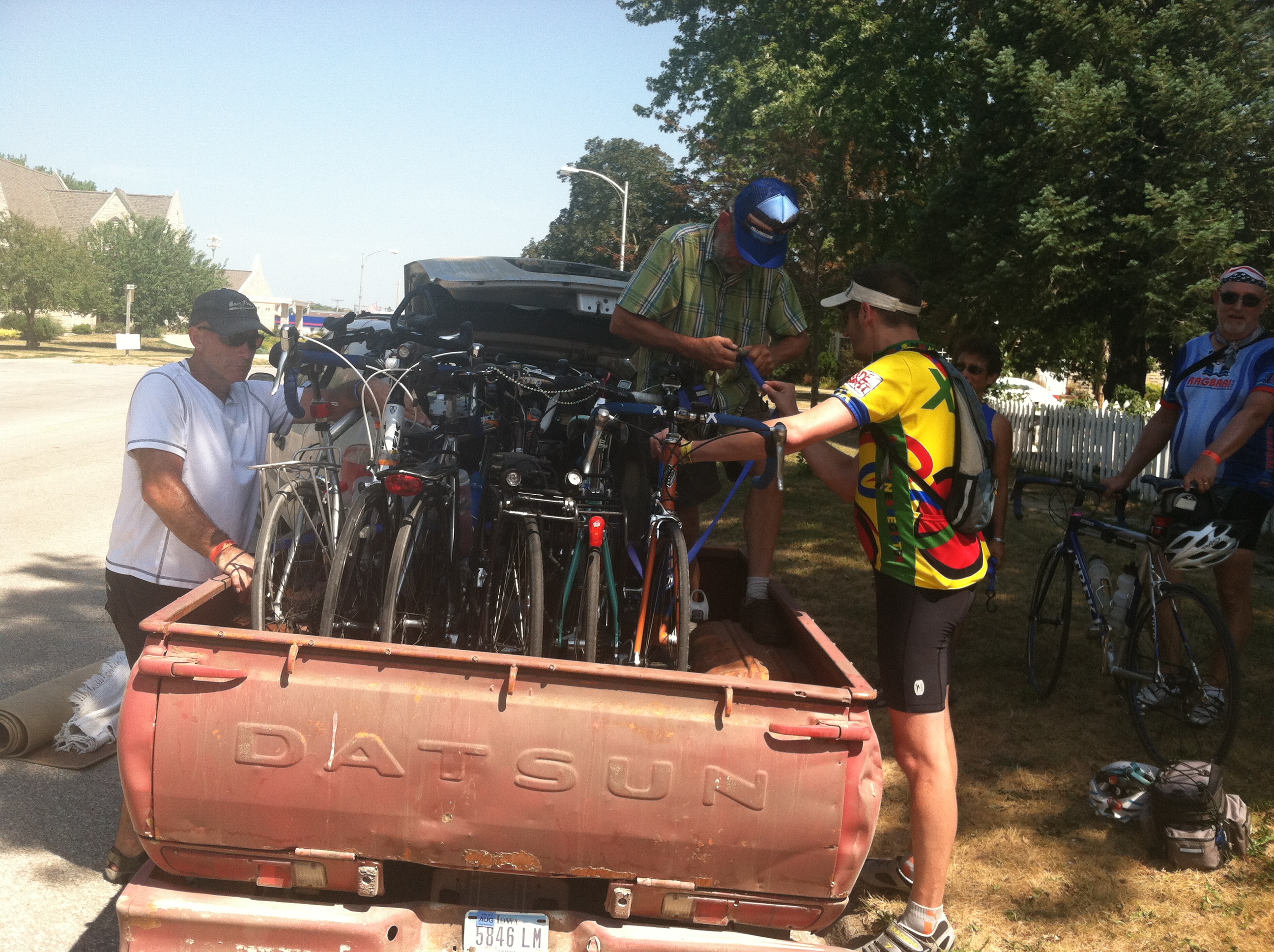 It also included Tom Arney, a Morrison member from way back. He met up with us in Gowrie and hauled seven of us and our bikes into Webster City. Some true-blue cyclists will look down their nose at this, insisting it isn’t really an official RAGBRAI unless you ride every mile.