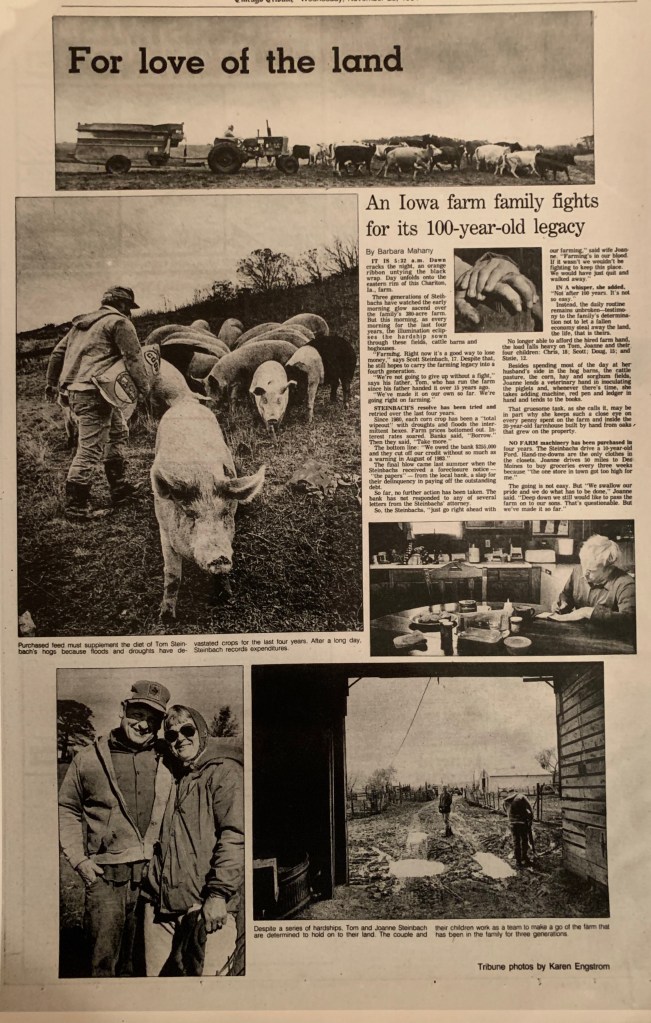 The Tribune story was one of many written about my parents during the Farm Crisis. They were featured in the New York Times, the Des Moines Register, National Public Radio and the CBS “Sunday Morning” news program hosted then by Charles Kuralt. Getting to meet some of these journalists probably had a bigger influence on me than I realized at the time and may have led to how I spent much of my working life.