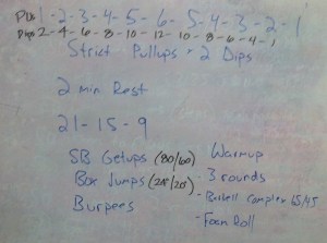 In additions to the stand ups and the Burpees, we did the same number of sets and repetitions of step ups on to a 24-inch wooden block.